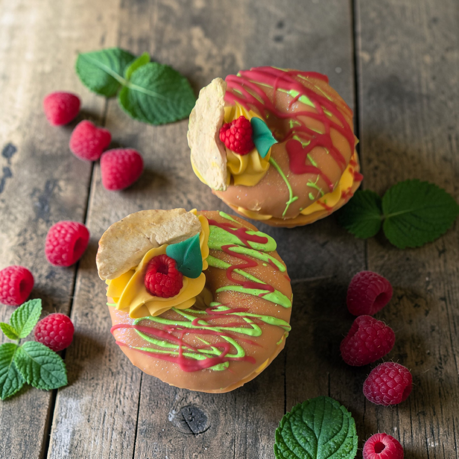 With crispy green apple and raspberries fragrance oils, this chocolate donut soap looks good enough to eat!