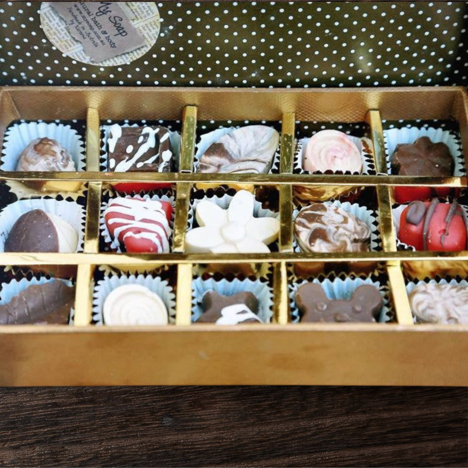 Filled with chocolate soaps, this is sure to be a unique gift to someone special. Box includes 15 chocolate size soaps plus a gift tag. For a handwritten message on your tag, simply leave a note upon checkout with what you'd like written